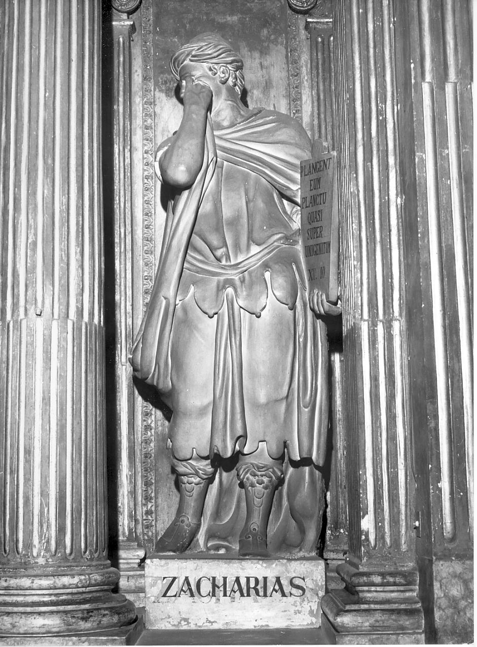 Il profeta è raffigurato in piedi in atto di astergersi le lacrime e con cartella nella sinistra recante una scritta biblica.