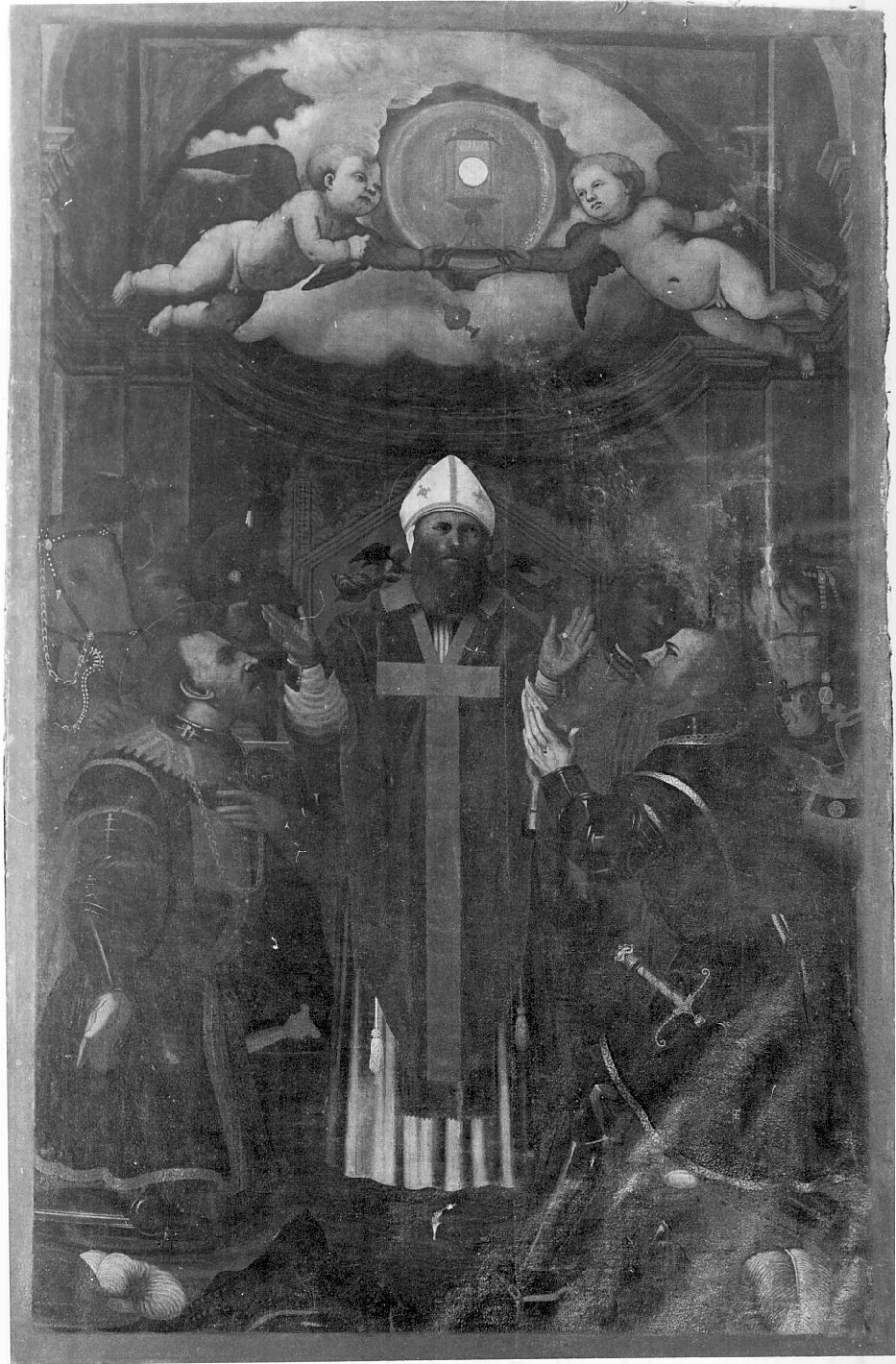 Al centro del dipinto è il vescovo Sant'Apollonio mentre benedice i Santi Faustino e Giovita. Ai suoi lati in alto due angioletti che spargono incenso col turibolo mentre sostengono un ostensorio architettonico con la Sacra Ostia.. Personaggi: Sant'Apollonio tra i Santi Faustino e Giovita