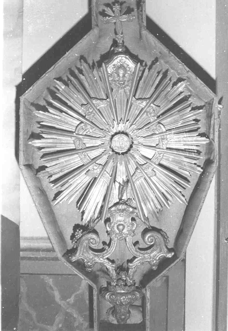 Sopra una base tondeggiante, sagomata e espansa si impostano due larghi bracci laterali a voluta, che si congiungono e riprendono a salire in forma di cerchio sagomato. Sulle volute grappoli. Attraverso il cerchio si innesta una raggiera d'argento molto ampia con al centro l'ostia. In alto una croce.