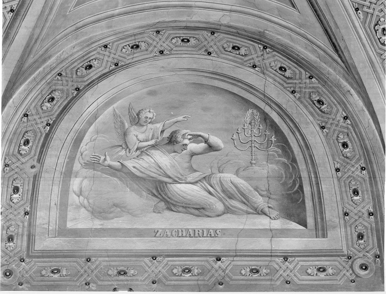 Soggetti sacri: in una lunetta incorniciata da greche racchiudenti motivi vegetali e intervallate da borchie è raffigurato il profeta Zaccaria in atto pensoso che medita davanti al candelabro dalle sette braccia; alle sue spalle un angelo glielo indica