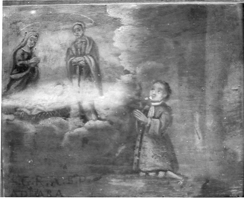 colori predominanti: marrone, giallo. Personaggi: Madonna delle Grazie; Gesù Bambino; San Giuseppe e un Santo. Fenomeni metereologici: nubi. Figure: devoto inginocchiato con mani giunte