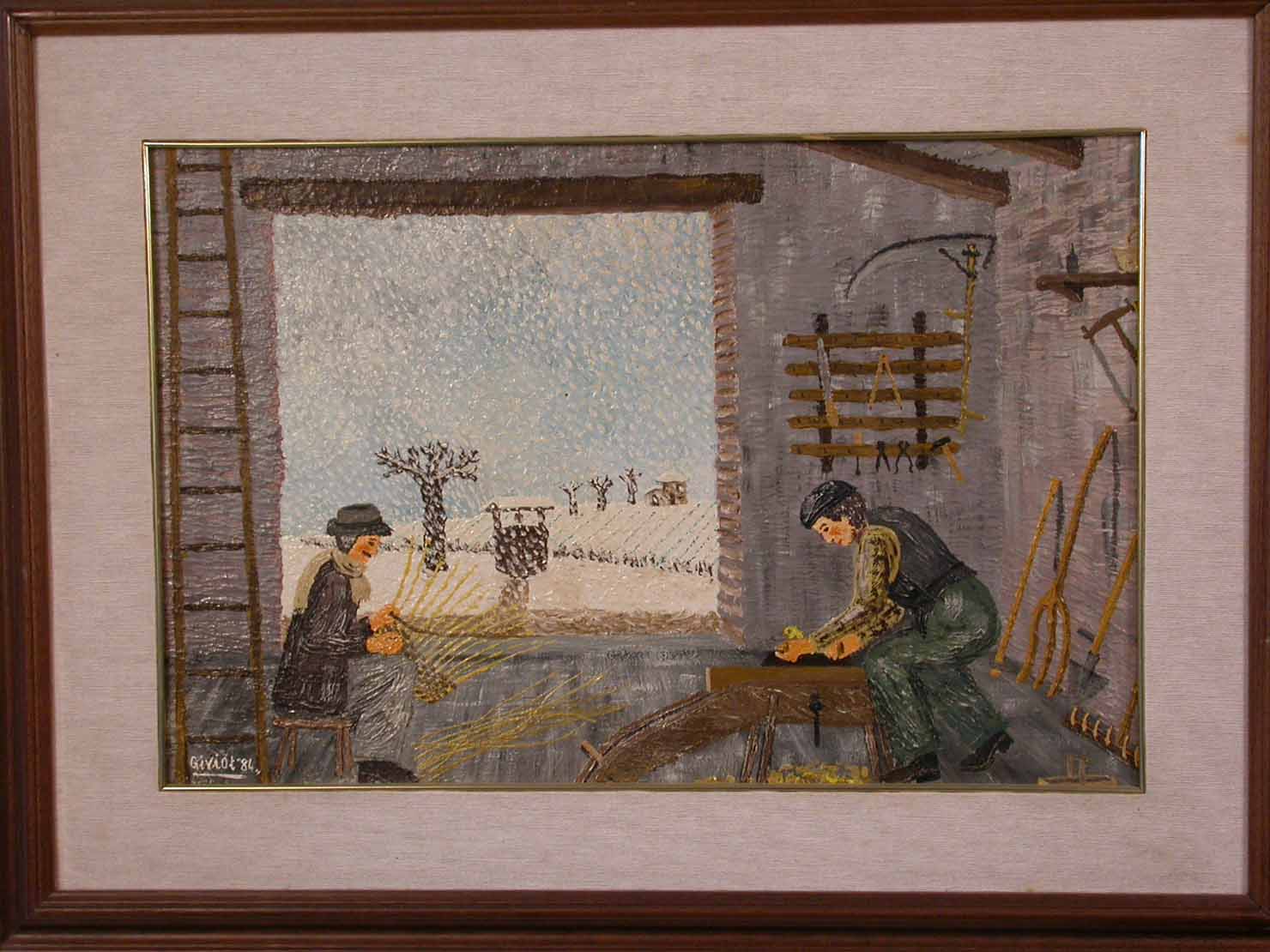 nel quadro sono rappresentati due uomini, uno intento a intrecciare vimini, un altro a piallare un pezzo di legno. Alle pareti sono appoggiati forconi di legno, una falce fienaia, mentre fuori dalla finestra si vede un paesaggio campestre invernale, con neve