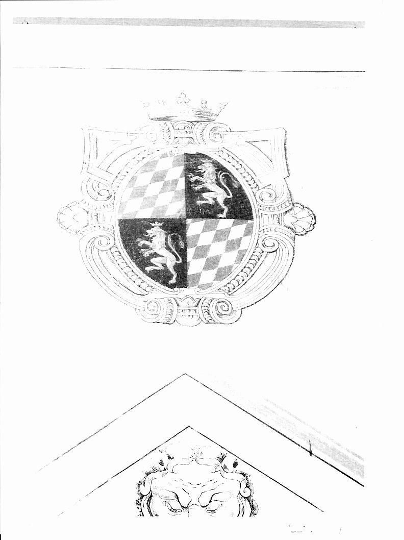 Lo stemma è incorniciato da un ricco motivo decorativo a volute ed è sormontato da una corona. Il campo inquartato, è scaccato nel primo e nel quarto e nel secondo e nel terzo raffigura un leone rampante coronato.. Araldica: stemma gentilizio della famiglia Baviera