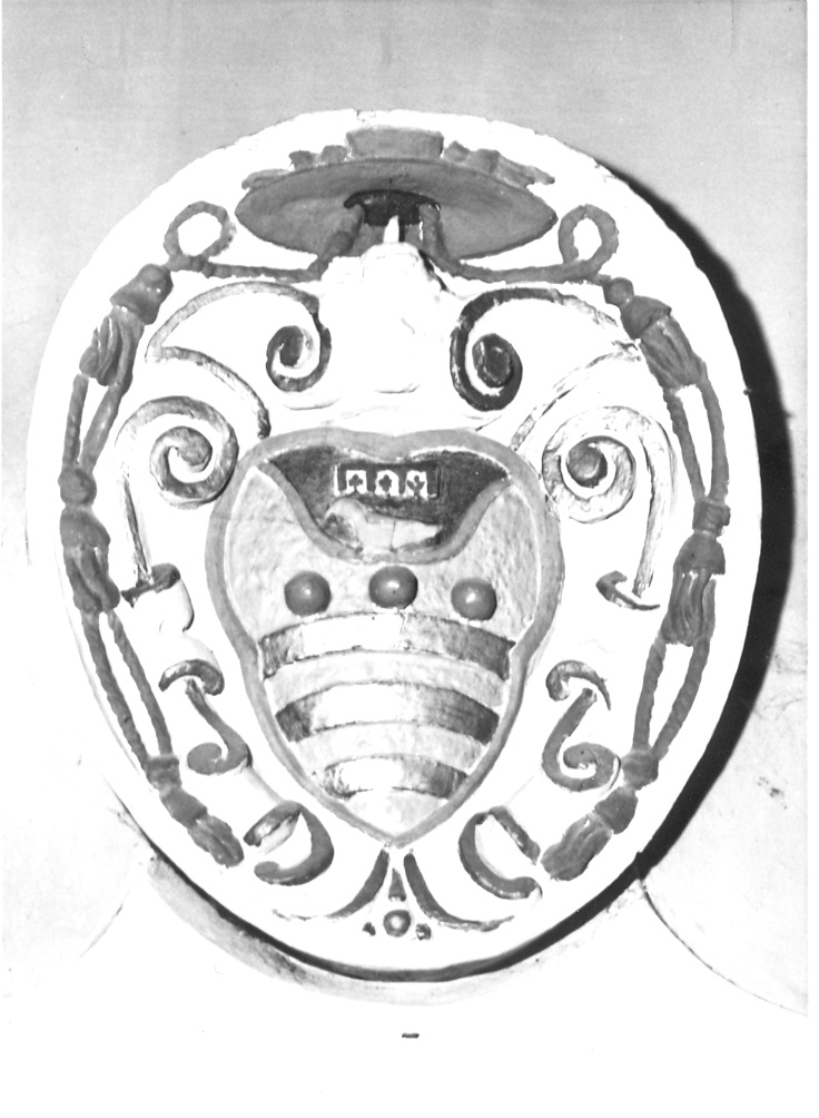 Decorazione plastica dipinta lungo i margini con motivi di cordoni e nappe che partono dal soprastante cappello cardinalizio; al centro stemma.