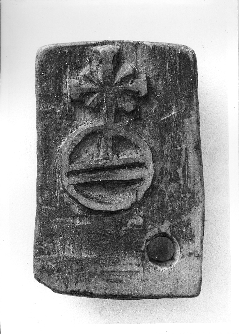 La tavoletta per tatuaggio di forma rettangolare, con foro circolare in basso al centro, reca inciso l'ecumene con croce.. Simboli: ecumene con croce