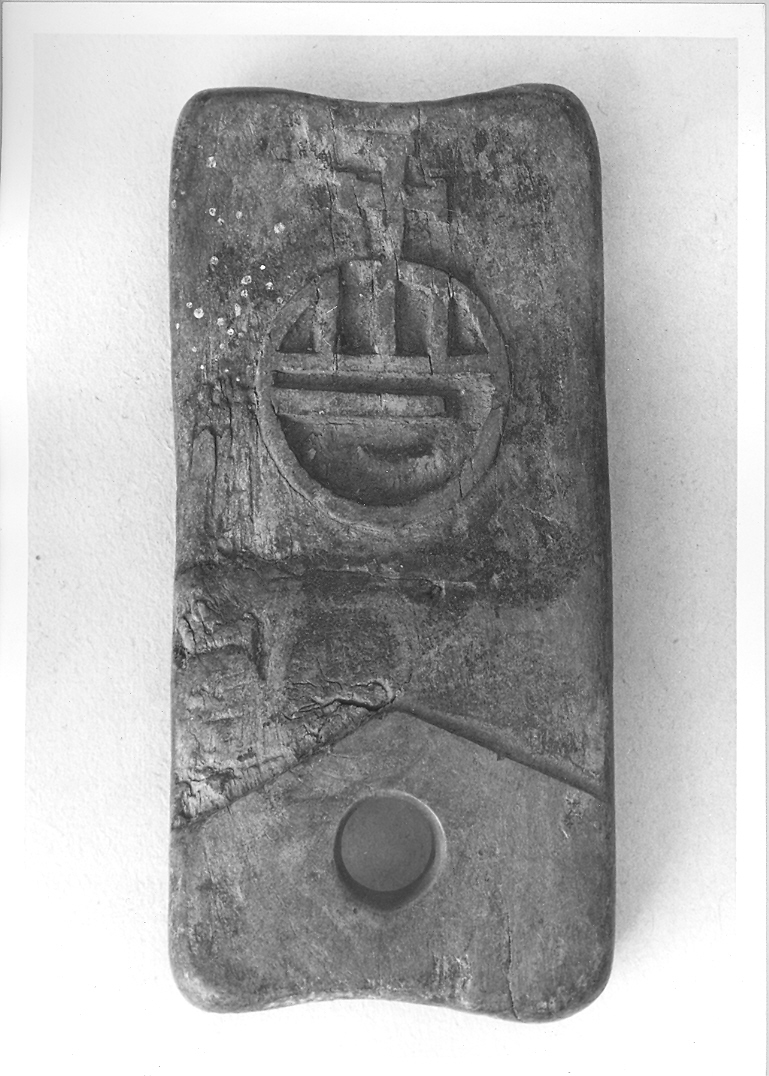 La tavoletta per tatuaggio di forma rettangolare, con foro circolare in basso al centro, reca inciso l'ecumene con croce.. Simboli: ecumene con croce