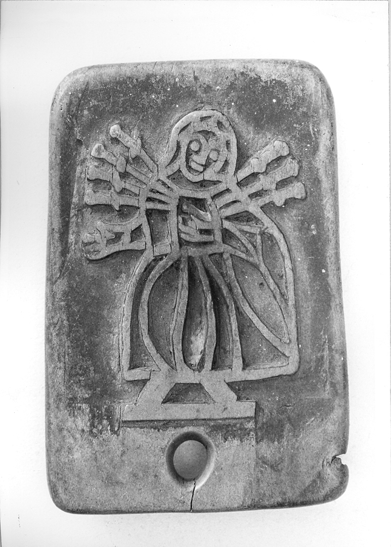 La tavoletta per tatuaggio di forma rettangolare con foro circolare al centro, recante in basso incisa l'immagine della Madonna dei sette dolori.. Personaggi: Madonna. Attributi: (Madonna) sette spade