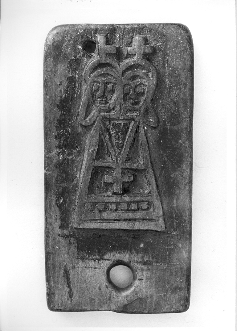 La tavoletta per tatuaggio di forma rettangolare con foro in basso al centro, reca incisa l'immagine della Madonna di Loreto nella sua iconografia tradizionale.. Personaggi: Madonna di Loreto