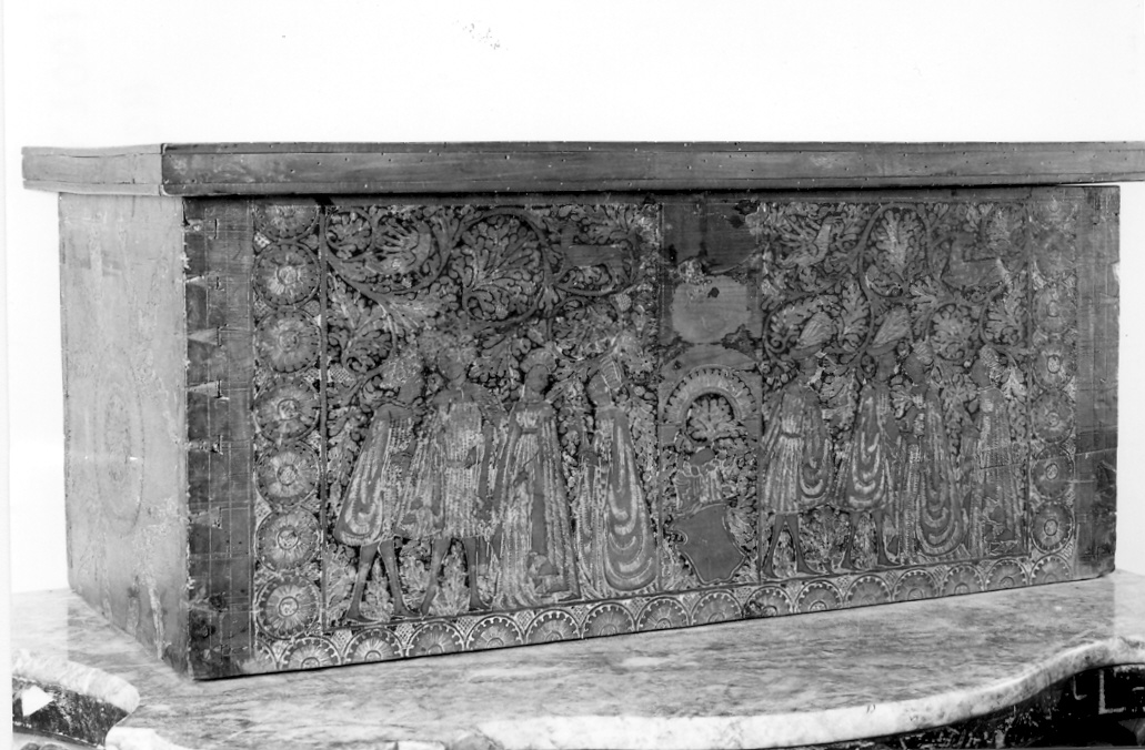 Cassa adibita a contenere parte della dote. Sul davanti è presente una decorazione incisa e dipinta raffigurante un corteo nuziale con uomini e donne riccamente abbigliati, inseriti in un giardino fortemente stilizzato con alberi e selvaggina secondo i moduli ancora persistenti del gotico internazionale. Ai fianchi e all'interno sono presenti fregi e rosoni.