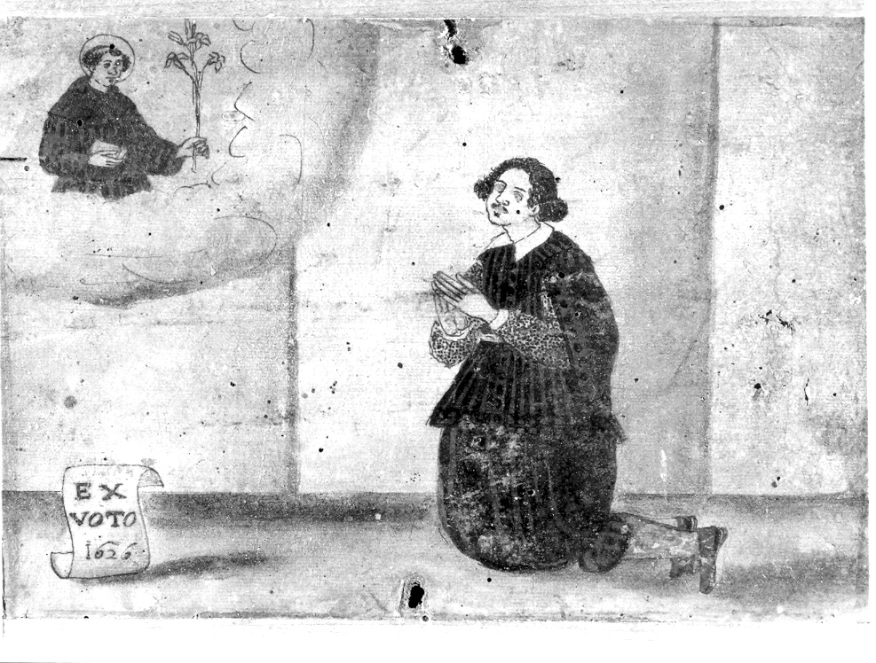 Personaggi: giovane; San Nicola da Tolentino. Attributi: (San Nicola da Tolentino) giglio. Abbigliamento: veste scura