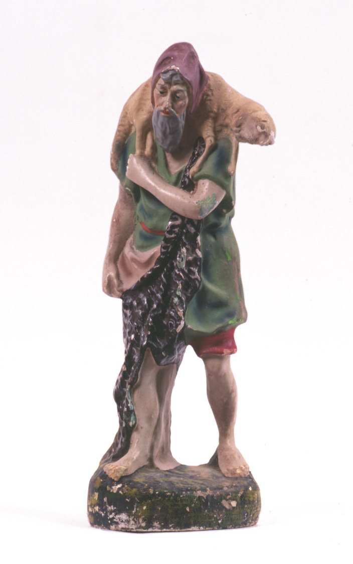 Figure: pastore. Abbigliamento: cappuccio. Oggetti: bisaccia. Animali: pecora
