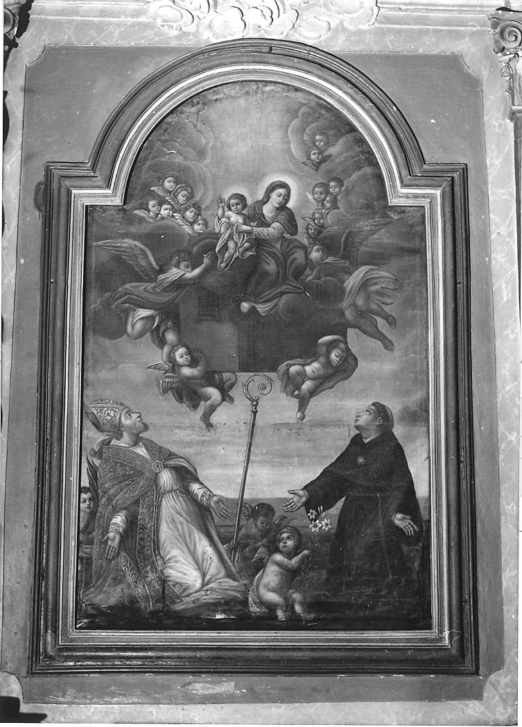 Personaggi: Madonna; Gesù Bambino; San Nicola da Tolentino. Figure: santo vescovo; angeli; cherubini. Attributi: (San Nicola da Tolentino) giglio; (santo vescovo) pastorale