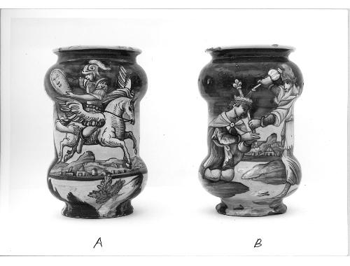 Vaso da farmacia a rocchetto a superficie integralmente decorata. Vi è raffigurato Samuele che versa l'unguento sulla testa di David, al quale porge anche lo scettro (1 Samuele 16, sgg.). Il paesaggio è collinoso con piccole case, nel verso del vaso, e marino sul retro.. Personaggi: Samuele; David. Oggetti: brocca; corona. Paesaggi