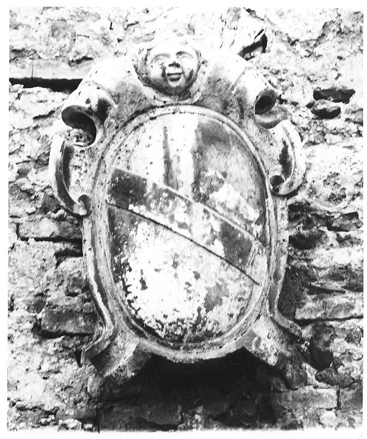 Stemma accartocciato, sormontato da una testa di cherubino, con scudo interzato in banda.