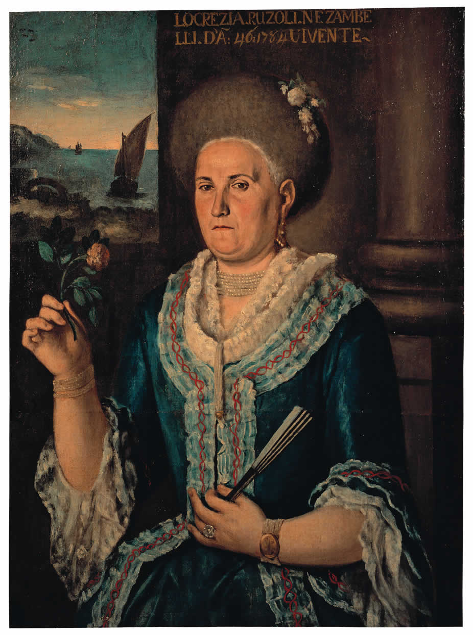 Ritratti: Ruzoli Zambelli Lucrezia. Abbigliamento: contemporaneo. Oggetti: gioielli; ventaglio. Fiori: rosa. Elementi architettonici: base di colonna; finestra. Paesaggi. Mare. Mezzi di trasporto: barca a vela