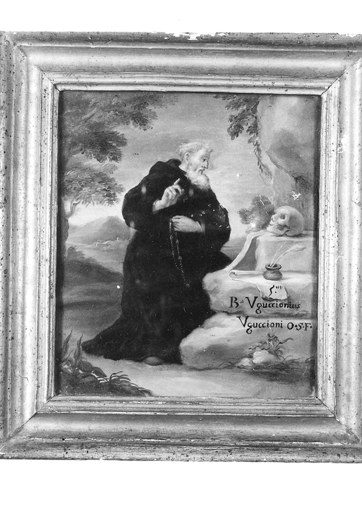 Personaggi: Sant'Uguccione. Oggetti: Rosario; teschio. Paesaggi: rocce; alberi; colline