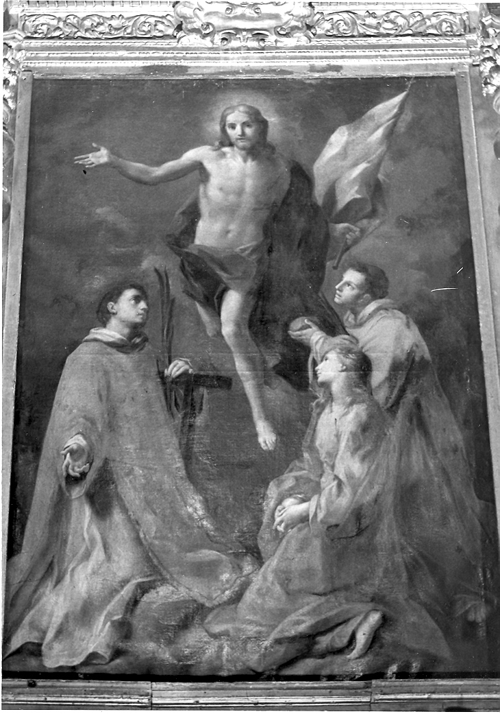 Il Cristo risorto ascende al cielo stringendo sulla sinistra una bandiera bianca sormontata da una croce. In basso, in adorazione, San Lorenzo con la graticola e la palma del martirio, Santo Stefano che offre a Cristo la pietra del martirio e Santa Maria Maddalena con le mani giunte che stringono il vasetto degli olii.. Personaggi: Gesù Cristo; San Lorenzo; Santo Stefano; Santa Maria Maddalena