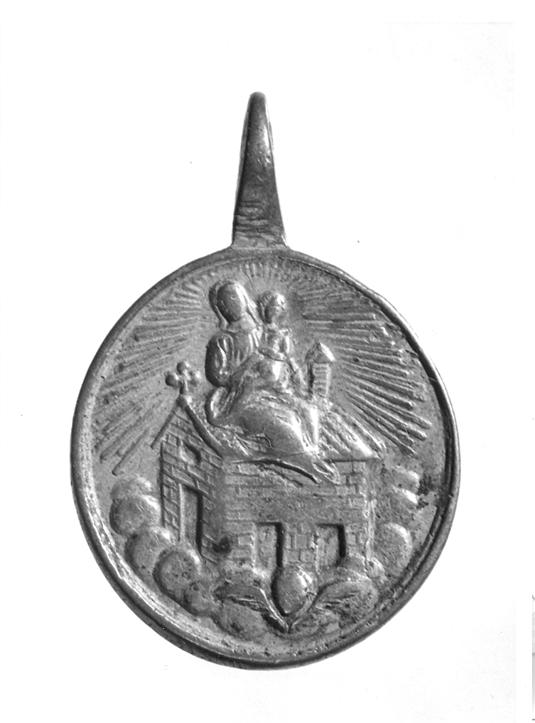 Medaglia di forma ovale raffigurante sul dritto la Cappella lauretana sorretta da due angeli in volo tra nubi, con, al di sopra, la Madonna e il Bambino con capi raggiati e sul rovescio crocifisso con Cristo vestito di una lunga tunica e affiancato da cherubini con torcia.
