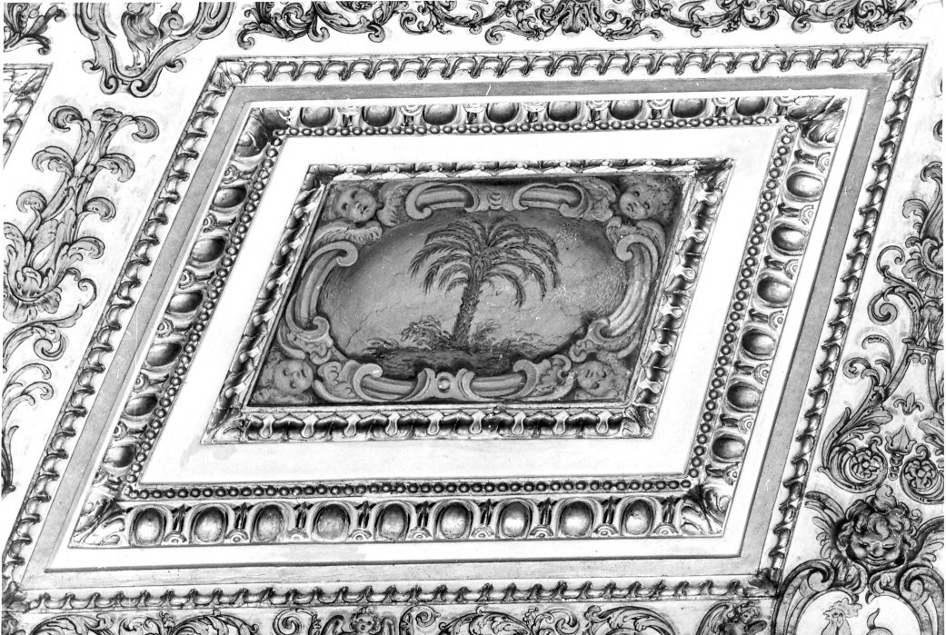 Una corona di cherubini racchiude una palma in un contesto decorativo di stucchi dorati su sfondo bianco.. Figure: cherubini. Piante: palma