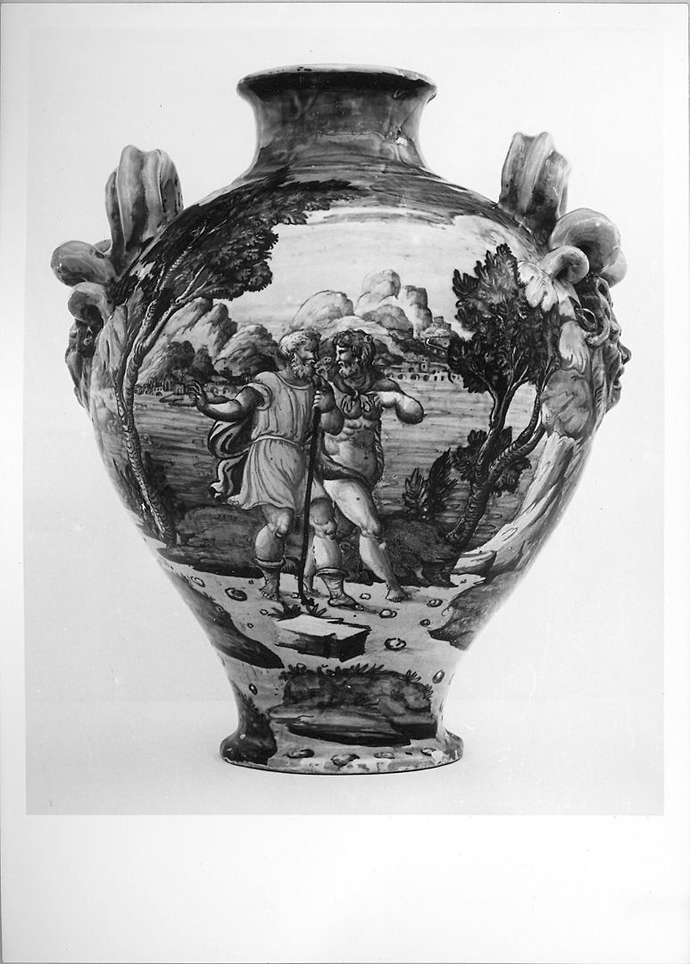 Idria con due manici a serpentello e protomi panniformi.. Personaggi: Camillo. Figure maschili. Oggetti: ara. Architetture fantastiche