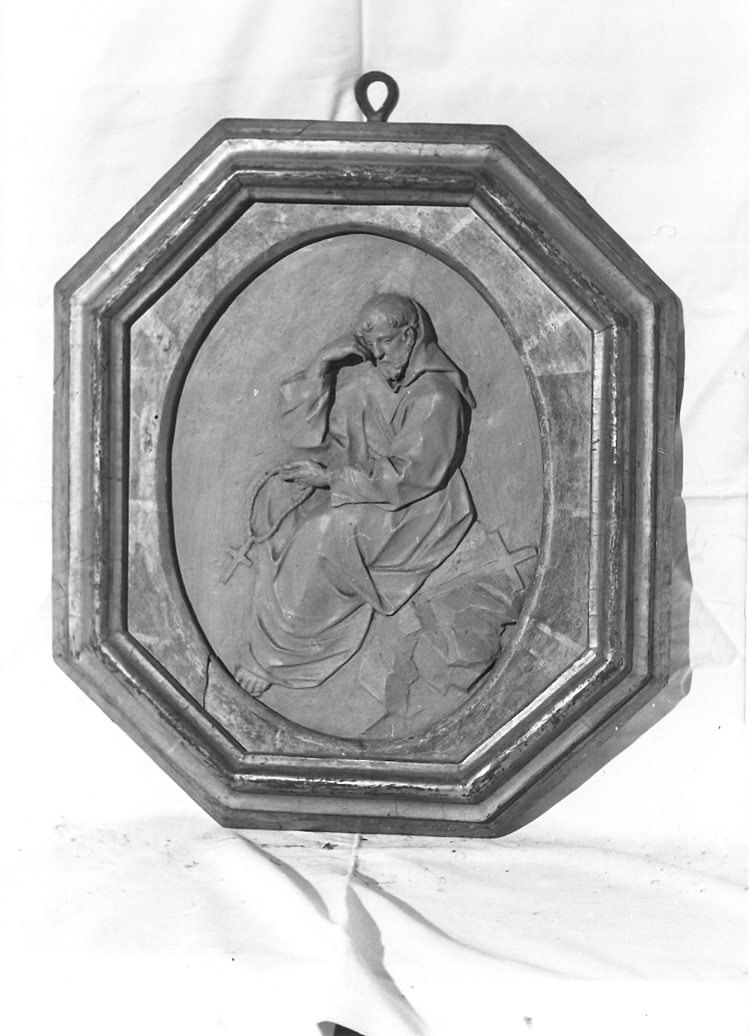Rilievo in stucco con cornice ottagonale.. Figure: frate cappuccino. Abbigliamento religioso. Oggetti: croce; rosario. Paesaggi: roccioso