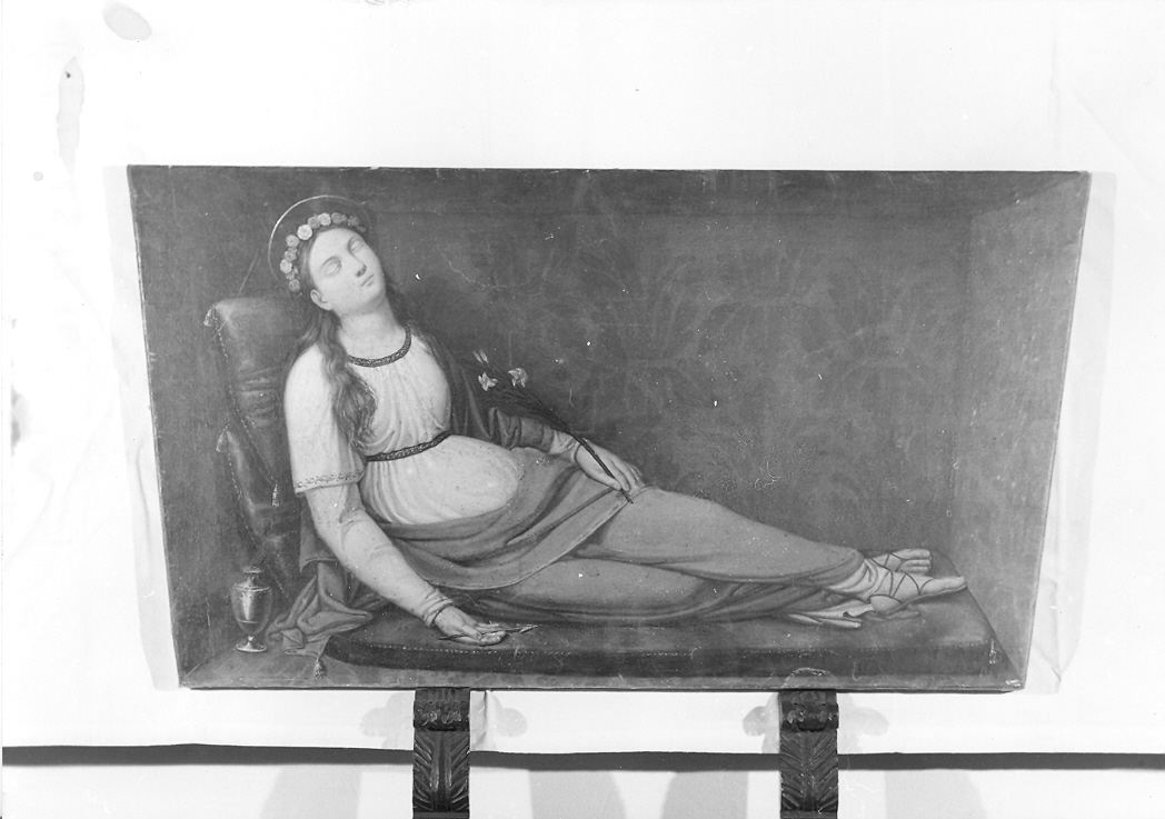 Personaggi: Santa Palazia. Attributi: (Santa Palazia) gigli. Oggetti: cuscino; ampolla; ghirlanda di fiori. Interno: urna