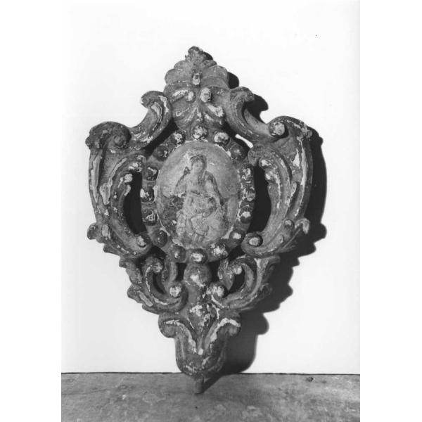 In un ovale al centro è dipinta a tempera la Madonna della Misericordia, intorno una cornice a perle, volute e fogliame.
