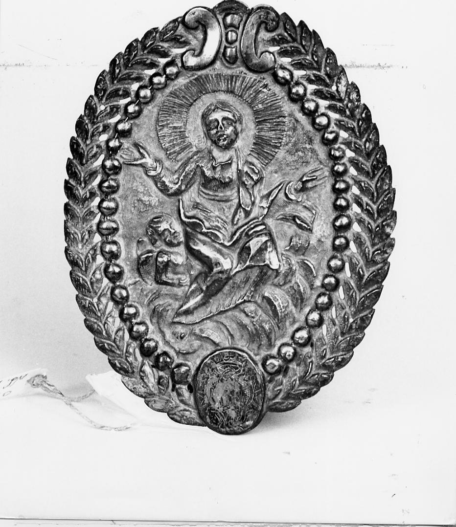 La placchetta è inquadrata da un serto e da una cornice puntinata.. Personaggi: Madonna. Figure: angelo