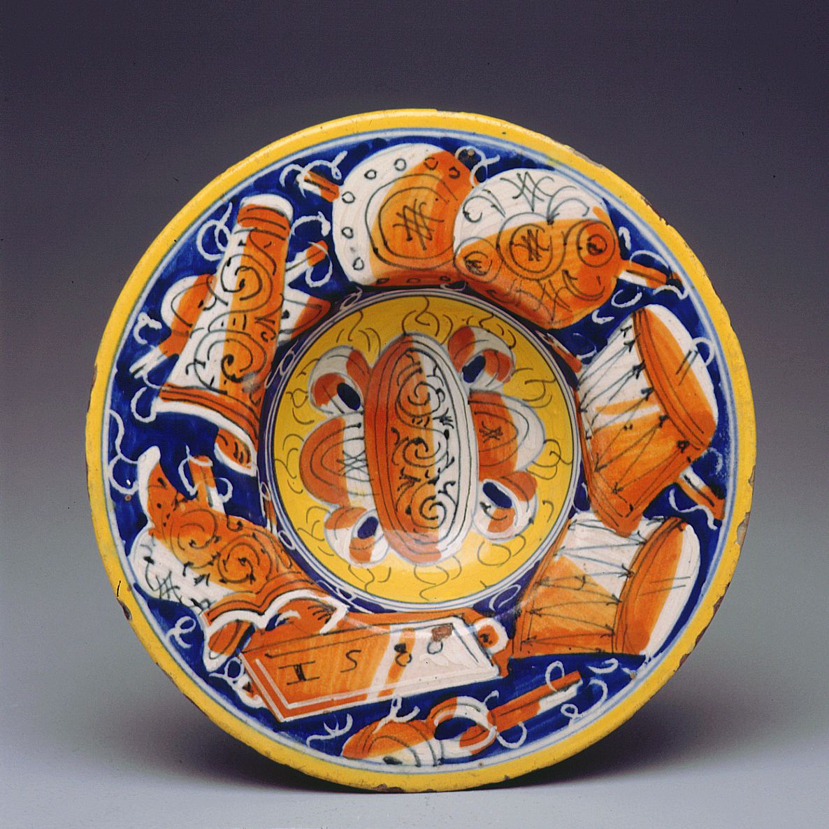 Nel cavetto, su fondo giallino, sono raffigurati trofei incrociati in chiaroscuro arancio-ocraceo con quattro tocchi di turchino agli angoli. Sulla tesa, trofei su fondo blu e, fra questi, una targa con la data. Colori: giallo, arancio, azzurro, bianchetto