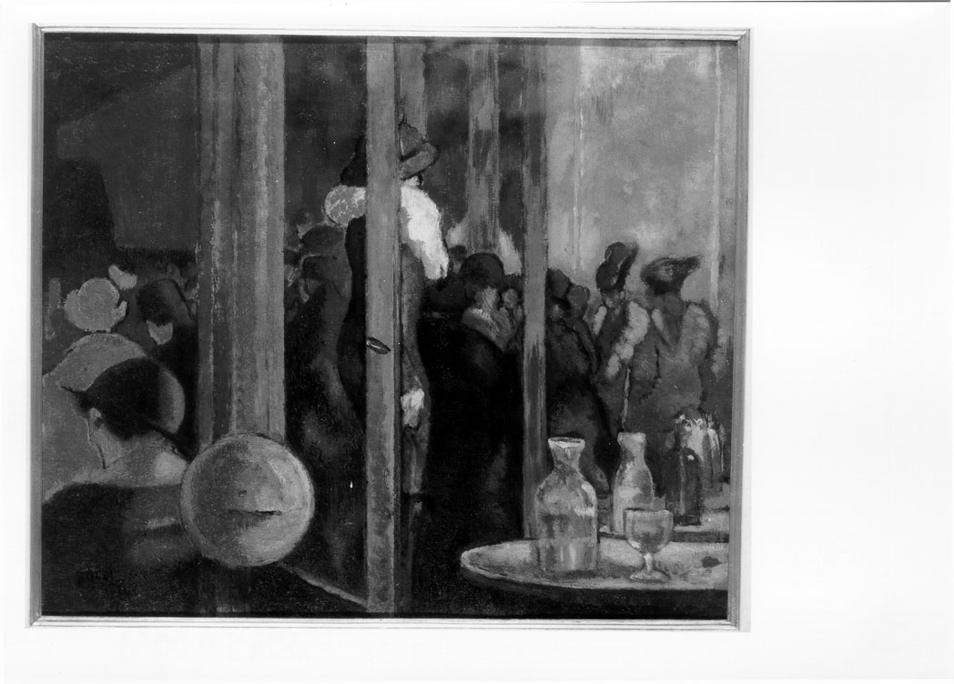 Interno: Caffè Cyrano. Oggetti: tavolo; bottiglie. Figure