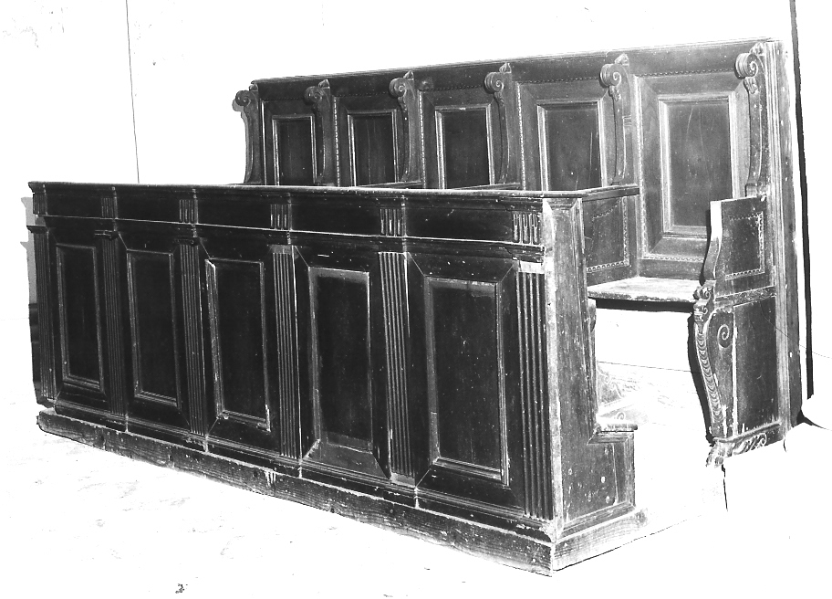 Il banco ha cinque sedili suddivisi da braccioli lavorati a volute ed elegantemente intagliati. Ogni schienale ha diverse cornici e in alto, in corrispondenza dei braccioli, una voluta. Anche i piedi dei sedili hanno incise delle volute terminanti a zampa di leone. L'inginocchiatoio sul davanti è suddiviso in altrettante riquadrature simili per mezzo di piccoli pilastri con capitello ionico.