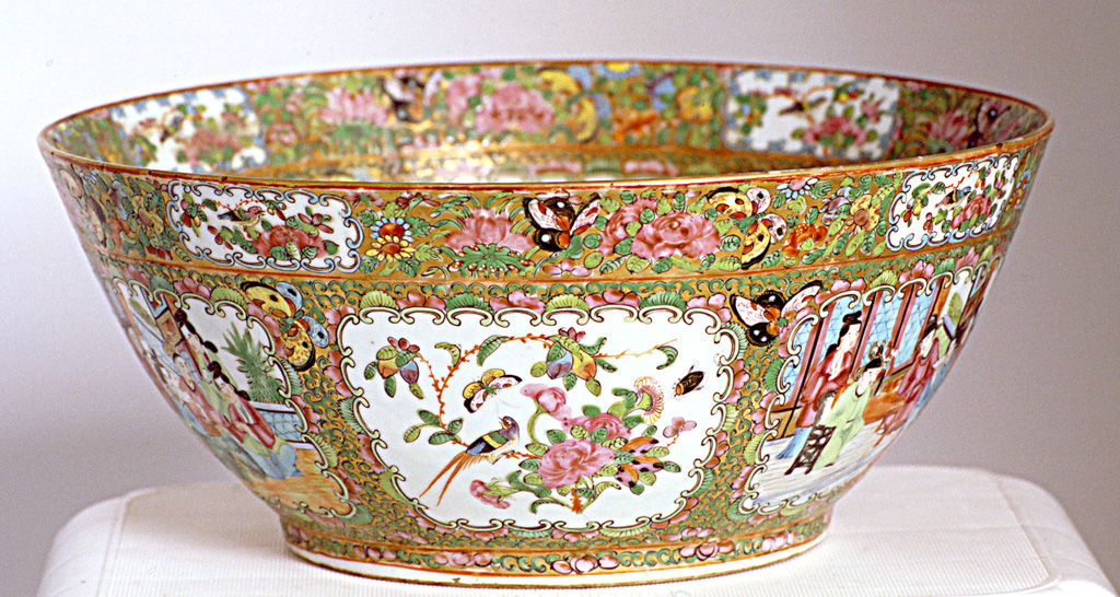 Coppa cinese con base a sezione circolare, corpo semiglobulare, dipinta con scene di vita di corte nei colori prevalenti di verde, celeste e rosa e rifinita in oro.. Figure: figure maschili; figure femminili. Interno. Abbigliamento: abbigliamento orientale. Animali: uccelli; farfalle. Piante: fiori. Decorazioni
