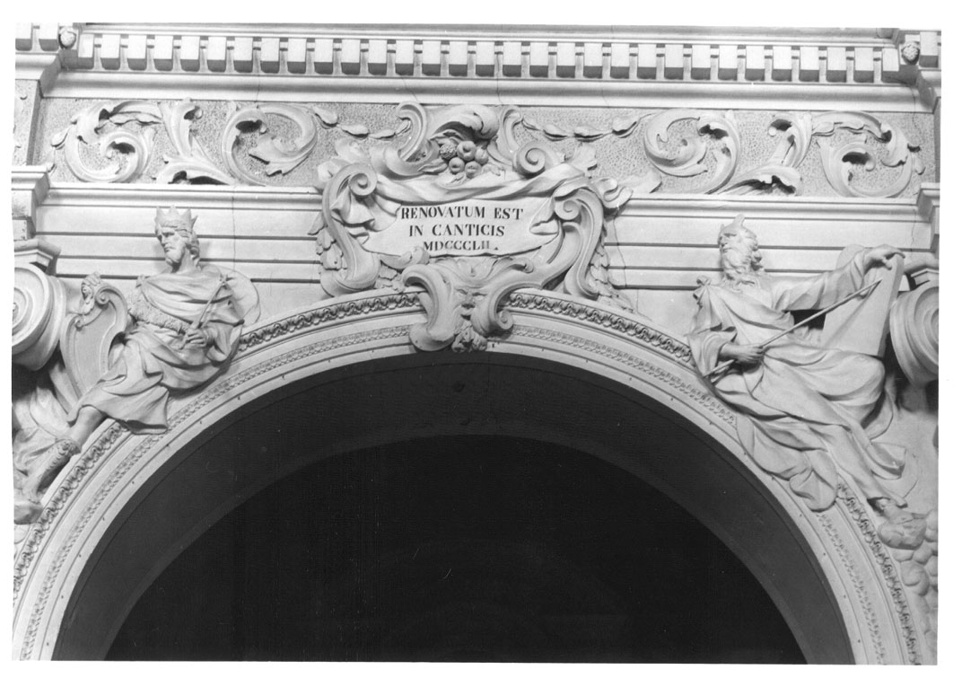 Nel pennacchio sinistro sta la statua di David, raffigurato con una corona in capo e regge, con la destra, un'arpa mentre alla sinistra tiene uno scettro; nel pennacchio destro Mosè è raffigurato con la tipica fascia di luce alle tempie, mentre indica con un'asta le tavole che sorregge con il braccio sinistro; al centro dell'arco il drappo con l'iscrizione è incorniciato da volute che inferiormente unendosi si trasformano in un mascherone.. Personaggi: David; Mosè