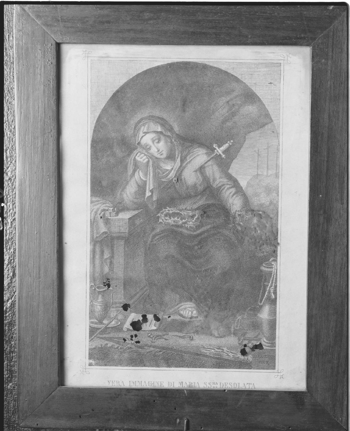 Personaggi: Madonna Addolorata. Attributi: (Madonna Addolorata) pugnale. Abbigliamento religioso. Simboli del martirio: corona di spine; Veronica; croci; corda; martello; chiodi; lancia; asta imbevuta di fiele; cartiglio con iscrizione; brocca; vassoio; dadi; sudario. Elementi architettonici: base. Oggetti: anfora. Vedute: Gerusalemme: Monte Calvario