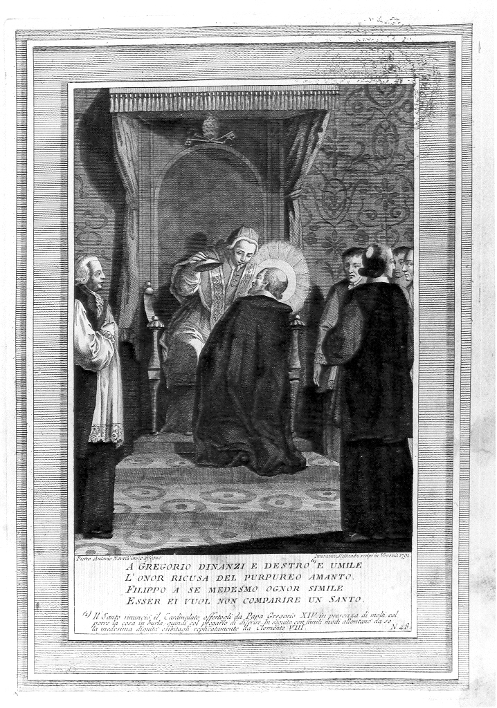 Personaggi: San Filippo Neri; papa Gregorio XIV. Abbigliamento religioso. Figure maschili. Interno. Mobilia: trono