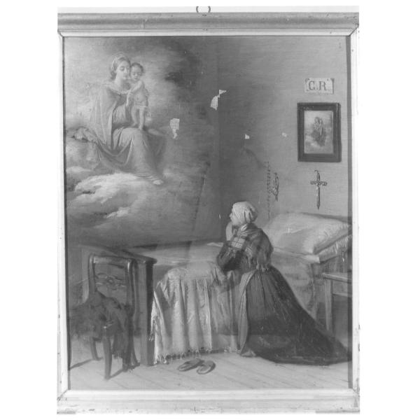 Dipinto. Personaggi: Madonna; Cristo Bambino. Figure femminili: donna. Oggetti: pantofole; quadro. Mobilia: letto; sedia