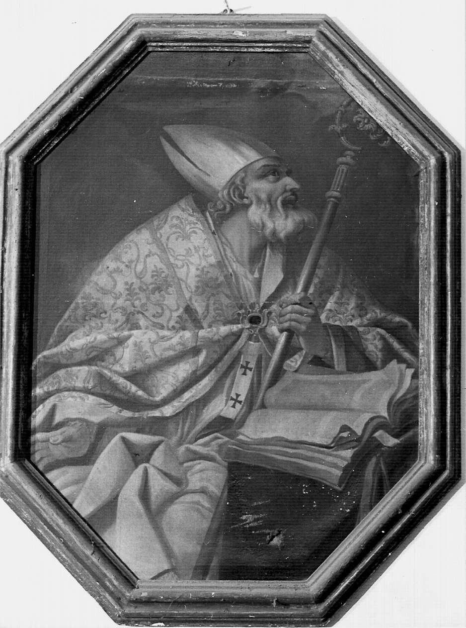 Il Santo è raffigurato a tre quarti, con abiti episcopali e la mitra; con la mano sinistra tiene un libro mentre la mano destra è sollevata in gesto di benedizione. Il dipinto presenta una cornice lignea di forma ottagonale modanata dorata a foglia.