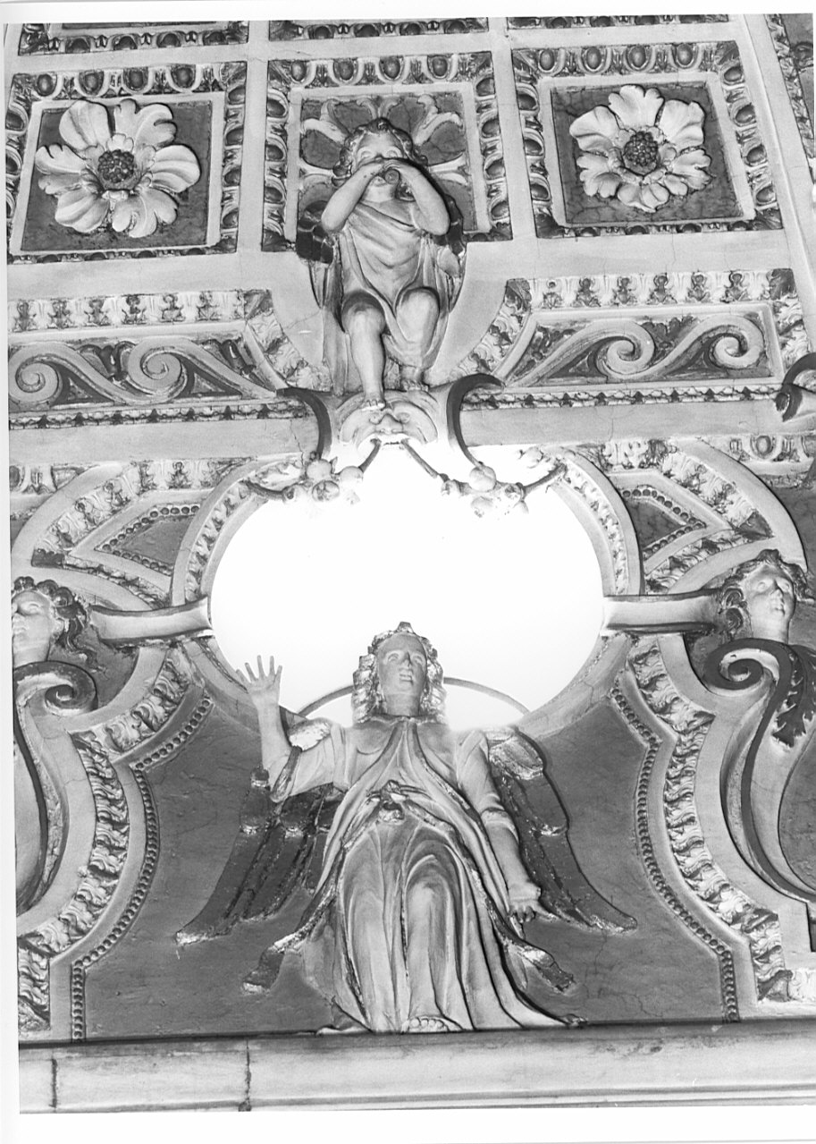 Statua entro una cornice a volute racchiudente una finestra circolare.. Figure: angelo; angioletto
