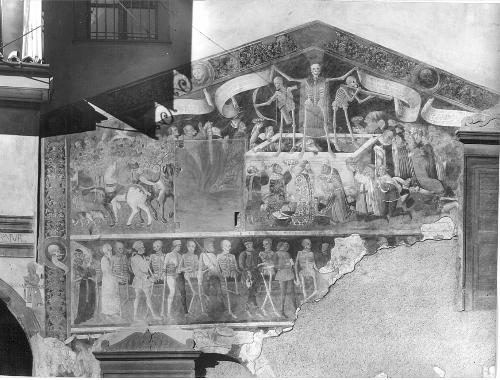 Trionfo della Morte: lo scheletro della Morte troneggia incoronata sul sarcofago aperto, in cui giacciono un imperatore e un papa. i lati altri due scheletri, uno con arco e faretra e l'altro in atto di manovrare un'arma a canne. Asinistra: boschetto fiorito con gentiluomini, sorpresi dalla morte mentre vanno a caccia. Al limite del bosco 5 personaggi in ginocchio cercano di placare la Morte, invano, facendo offerte. Sarcofago cosparso di rane, serpi e scorpioni, davanti al quale altri ricchi personaggi, tra cui un doge. A destra: personaggi inginocchiati imploranti, papa, cardinali, vescovi, frati e due dignitari laici.. Figure: nobili; doge; papa; cardinali; vescovi; frati; dignitari; scheletri; Personaggi: Morte; Animali: cani; falco; cavalli; rane; serpi; scorpioni; Oggetti: sarcofago; Armi: arco; cannone