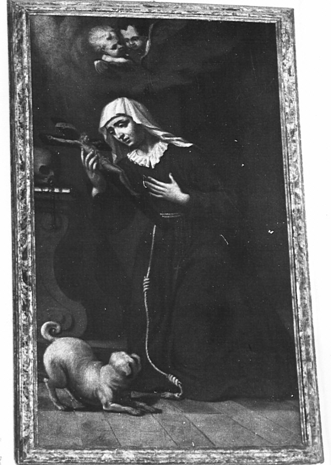 Personaggi: Santa Margherita. Abbigliamento religioso: saio brunodi terziaria francescana; velo bianco. Mobilia: inginocchiatoio a volute in legno. Figure: due cherubini. Attributi: (S. Margherita) crocefisso; libro; teschio; cane bianco