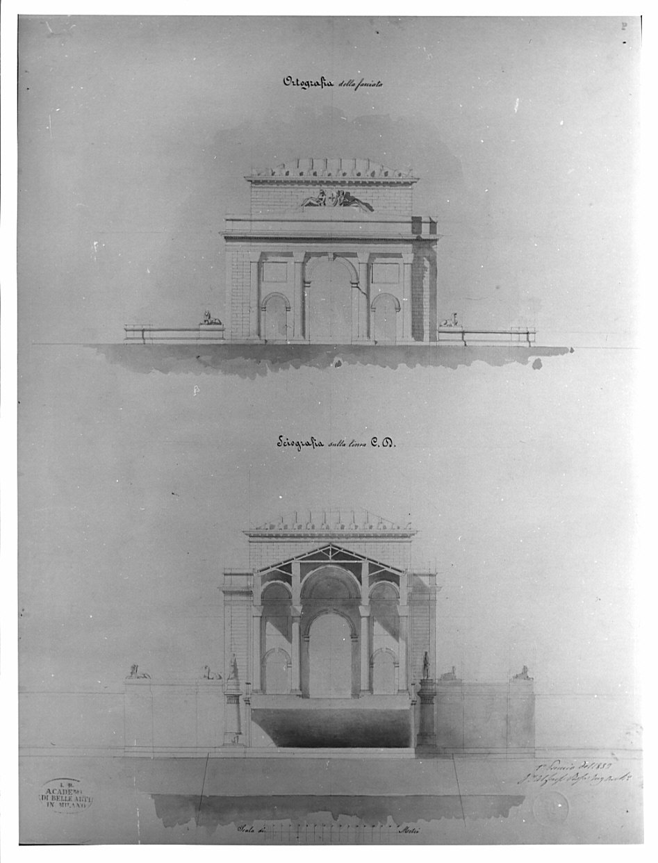 Prospetto principale (sup.) e sezione trasversale di un ponte coperto a china e bistro con ombreggiature. Terreno in acquarello beige, acqua in acquerello azzurro sfumato,murature sezionate in rosa e struttura della copertura in giallo. Ingresso al ponte; arco trionfale a tre fornici sormontato da trabeazione e alta cornice; al centro gruppo scultoreo. Sul fondo corpo più alto in muratura a vista con tetto a padiglione. Lat. parapetti ornati da statua leonina. Sezione trasversale del ponte: 3 carreggiate separate da colonne; al centro carreggiata maggiore. Copertura a falde. Lat. muri di sostegno delle scale. Sul fondo vista di corpo più alto in mattoni a vista.