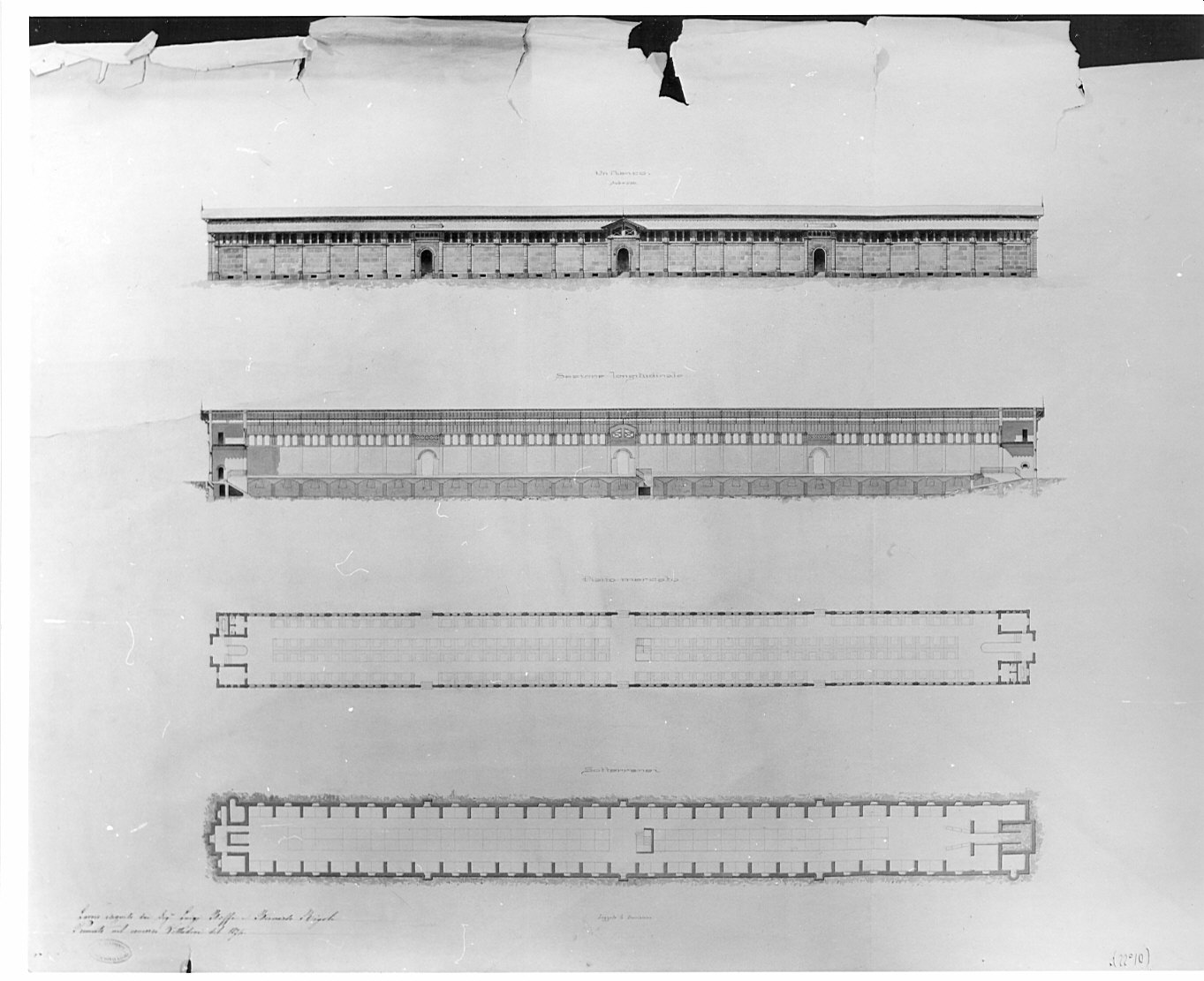 Progetto per un mercato coperto a Milano. Realizzato su carta pesante. Serie di quattro disegni di edificio a impianto longitudinale. Dal basso: planimetria dei sotterranei; planimetria del piano mercato con spazi commerciali (in doppia fila al centro, in fila singola ai lati); sezione raffigurante spazio longitudinale a tre ingressi con sotterraneo a volta e copertura a falde sfalsate; prospetto con muratura scandita da lesene bugnate, fascia finestrata e coperture a falde.