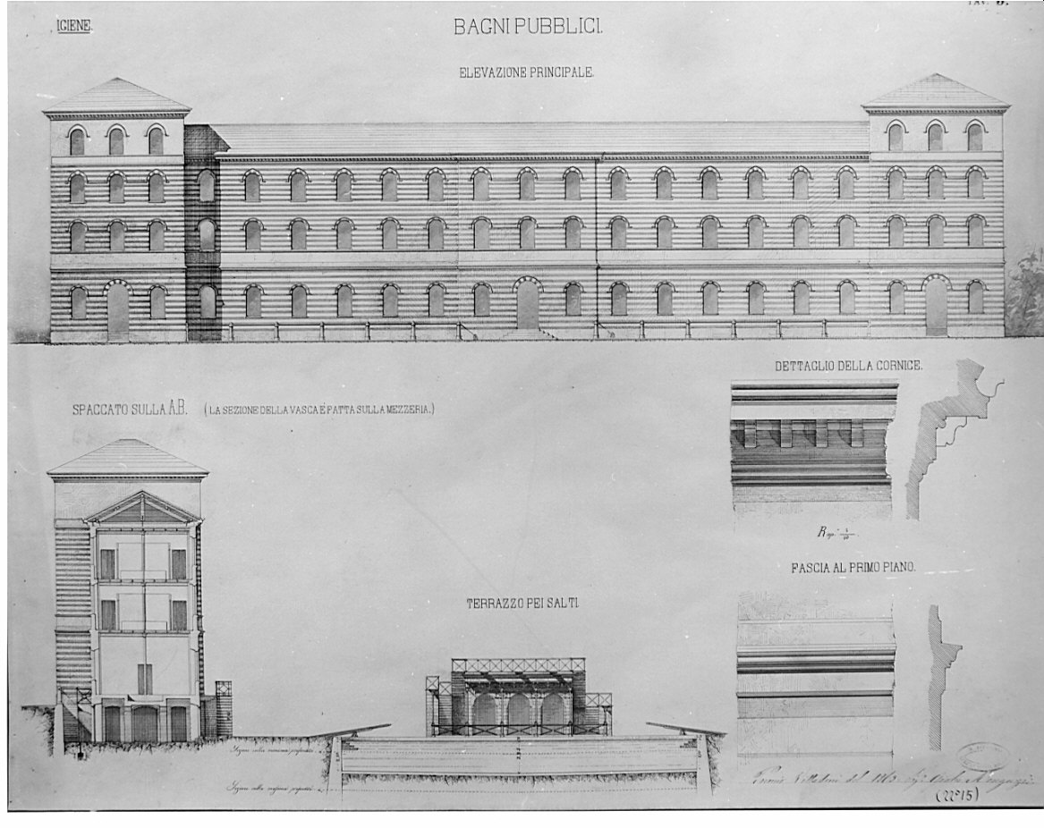 architettura: progetto di bagni pubblici con annesse scuole di ginnastica e di scherma, prospetto, sezioni e particolari