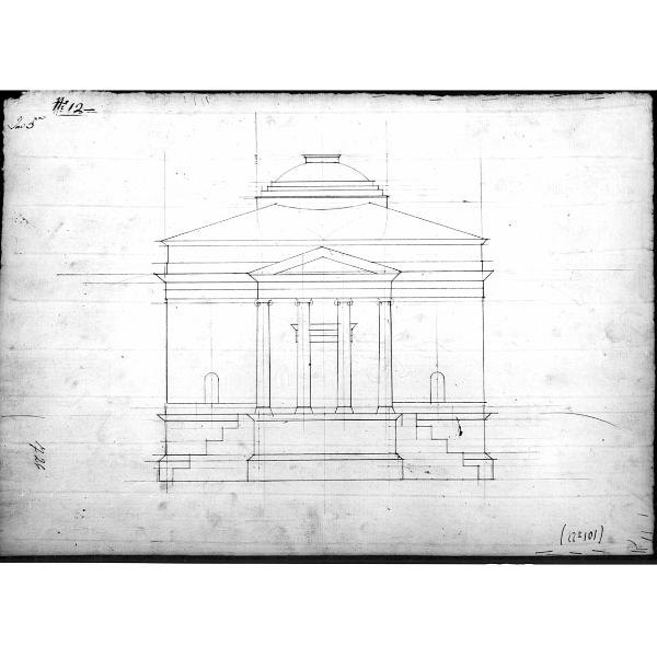 Prospetto di edificicio a matita e china su fondo chiaro. Edificio centrale con pronao preceduto da zoccolo e due gradinate d'accesso laterali. Quattro colonne ioniche, timpano centrale e copertura con cupola al centro ribassata e preceduta da gradoni.