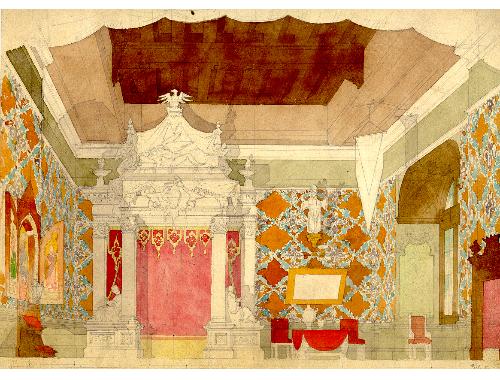 Architetture fantastiche: atto I scena II; interno di castello con soffitto a cassettoni; a sinistra grande edicola monumentale con insegne reali e a destra una finestra