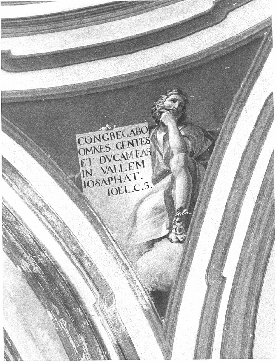 Figura di uomo maturo, seduto sulle nubi; indossa veste verde chiaro e manto lilla, e calza sandali in pelle. Appoggia il mento sulla mano sinistra con aria pensosa, e con la destra tiene una grande lapide marmorea con scritta. Fondo verde-azzurro. Affresco nel pennacchio a sinistra, verso la facciata.. Personaggi: Gioele. Oggetti: lapide marmorea con scritta