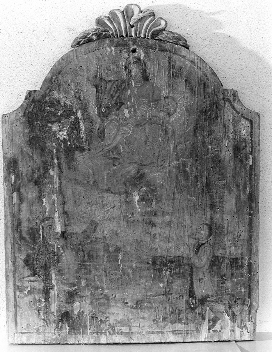 La tavola è sagomata, con piccolo fastigio a conchiglia.. Personaggi: Madonna; Cristo morto. Figure: devoti. Abbigliamento: casacca; corsetto