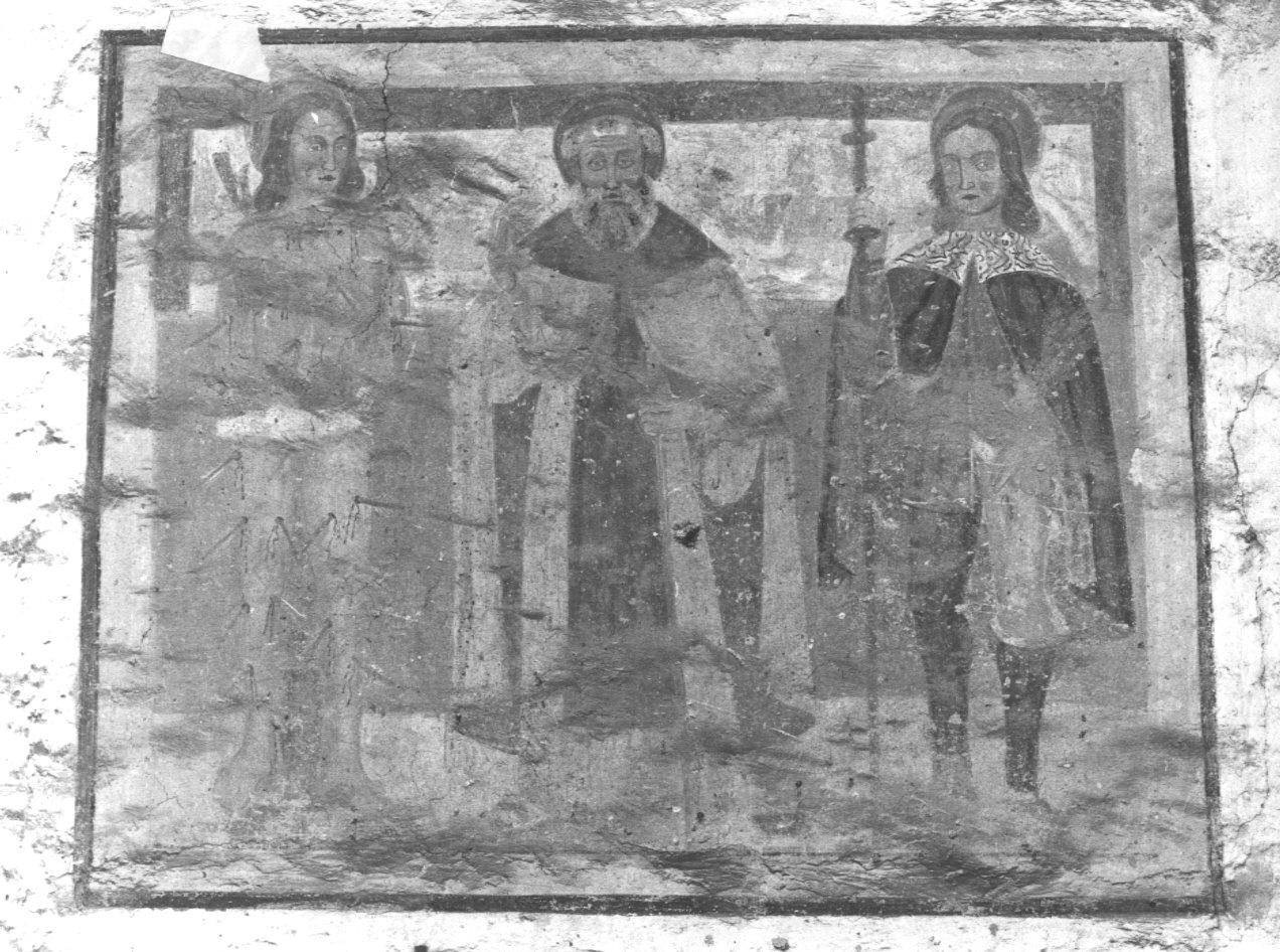 dipinto inserito in una cornice dipinta di forma rettangolare. Personaggi: San Sebastiano; Sant'Antonio Abate; San Rocco