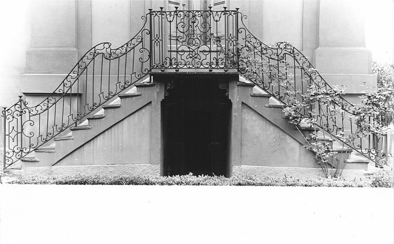 Ringhiere in quadrello e particolari decorativi in lamiera e in ottone (oggi coperto da vernfce nera); scandite da sbarre verticali ,le ringhiere hanno un disegno di volute intrecciate più complesso nel parapetto, arricchito da elementi vegetali in lamiera alquanto ammalorata.