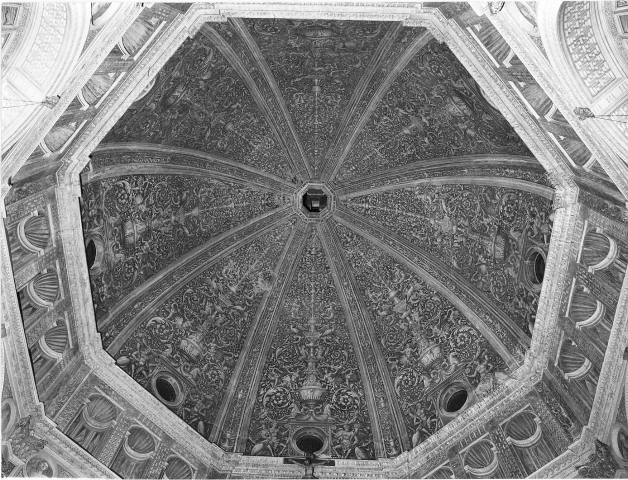 Tutto l'interno della cupola, scandita da arconi inquadrati in paraste con capitelli compositi, è decorata a grottesche, candelabre e girali color seppia su fondo azzurro. Numerose fasce di contorno sono decorate con greche viste in prospettiva di gusto classico, alcune delle quali sono state eseguite nel 1920, durante il restauro dell'interno della chiesa.